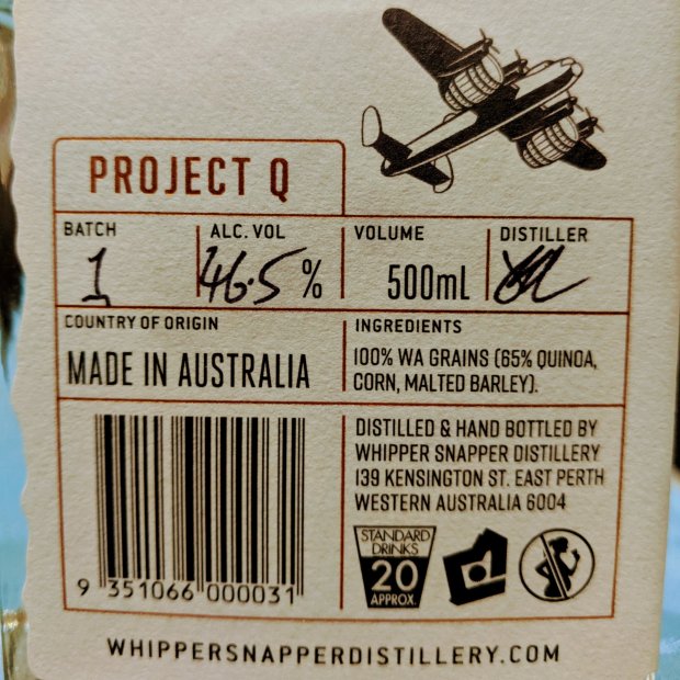 Made using a mash bill of 65% quinoa, 25% corn and 10% malted barley, all the grains are locally sourced from WA. The Project Q is aged for just under three years in the distillery’s own ex-Upshot barrels and bottled at (at least for Batch 1) 46.5%.